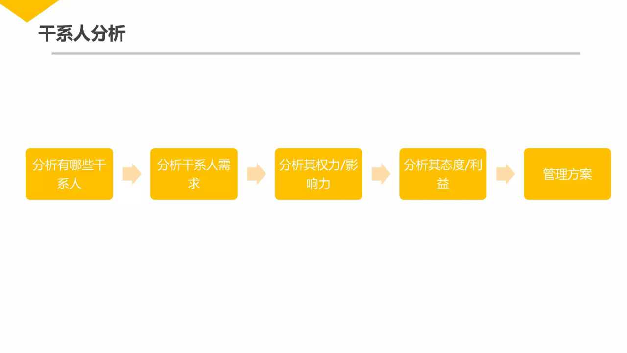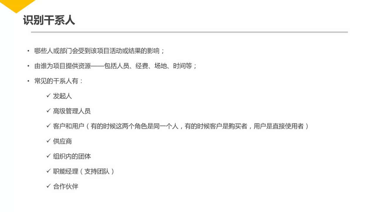10、關(guān)于干系人,寶潔的方法論是找出PACE。P是Participant(參與者),A是Approver(審批者),C是Consultant(顧問(wèn)),E是Executor(執(zhí)行者)。(謝謝Cicy)