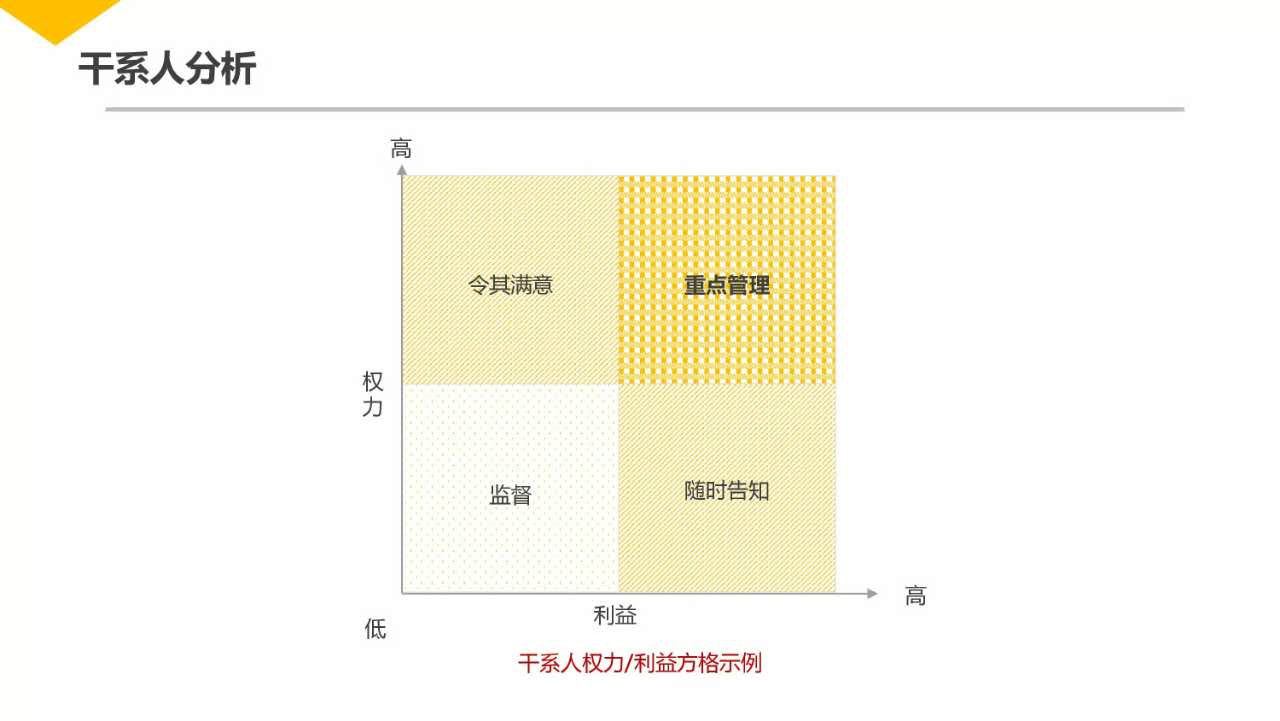 10、關(guān)于干系人,寶潔的方法論是找出PACE。P是Participant(參與者),A是Approver(審批者),C是Consultant(顧問(wèn)),E是Executor(執(zhí)行者)。(謝謝Cicy)