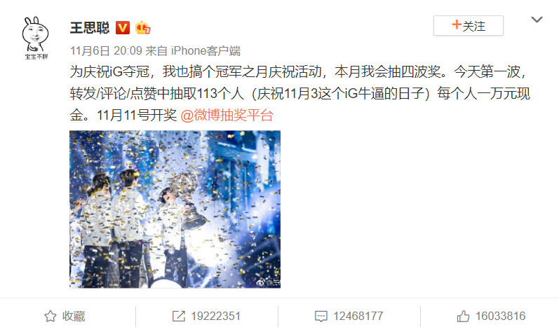 距離IG奪冠已經(jīng)過(guò)去一周了,勝利的喜悅將眾多的LOLer沖昏了頭腦,奪冠的那天,微博與微信朋友圈可謂是炸開(kāi)了鍋。在這里必須提兩件有意思的事情了,一是IG的中單,也是隊(duì)伍的靈魂人物,韓援Rookie由于和筷子兄弟的肖央長(zhǎng)相酷似,結(jié)果一群不明事理的人跑到人家的微博下面祝賀人家,第二件事就是IG的讀音和埃及類似,結(jié)果這樣一來(lái),很多人都以為埃及的法老復(fù)活了呢。好了,不扯這些沒(méi)用的,今天的主角是王校長(zhǎng),原諒我來(lái)跟一個(gè)過(guò)氣的熱點(diǎn)。前晚王校長(zhǎng)的撒幣行為,再一次用行為藝術(shù)給我們演繹了什么叫“有錢就能為所欲為”的真理,也繼錦鯉之后,再一次點(diǎn)燃了全民狂歡。